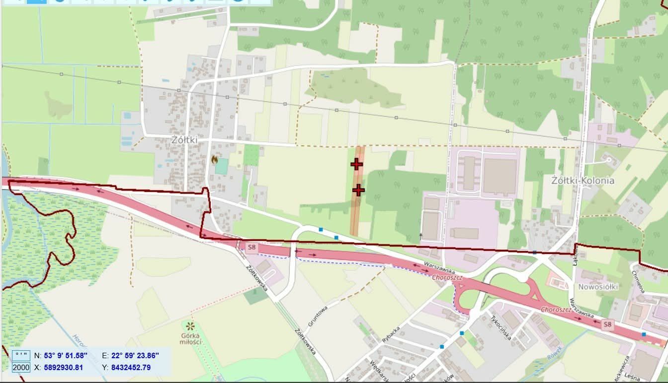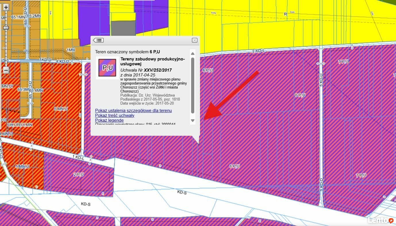 Na sprzedaż dwie działki przy trasie S8, 5 km od Białegostoku na jednej księdze wieczystej nr działek 981 i 982 obręb Żółtki, gmina Choroszcz, powiat Białostocki. Łączna powierzchnia 1,83 hektara. Szerokość 40 metrów, długość 439 metrów. Dostęp do drogi asfaltowej od strony południowej i północnej. Prąd w odległości 140 metrów, w sąsiedztwie magazyn Panatoni. Teren płaski, suchy, warunki budowlane dobre. Przeznaczenie w miejscowym planie zagospodarowania przestrzennego 6 PU pod zabudowę produkcyjną i usługową wraz z obiektami i urządzeniami towarzyszącymi. Założona księga wieczysta, własność. Cena do uzgodnienia. Tel 504 - pokaż numer telefonu -Szczegółowe zapisy panu :